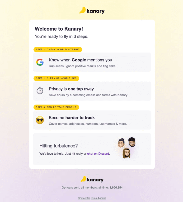 Now you can remove the highest impact risk by tapping the big yellow button. This triggers an automated removal request from you phone. Depending on the opt out methods available on a site, Kanary will either fill out a site's opt out form for you, live, or show you a pre-formatted email to send with one tap. You can also tap into each of the results one by one to review the screenshot and removal steps. Since Kanary scans broadly across Google to find sites surfacing sensitive information, it may identify risks that it hasn’t seen before. In those cases, you’ll see an option to connect with the Discord community to get support on next steps.
