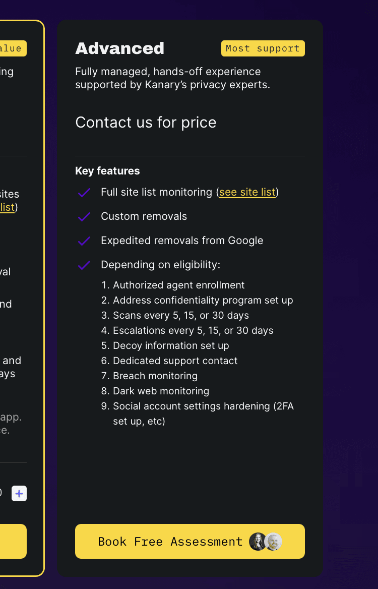 Kanary support available to review results, provide additional research, add new sites, but does not manage removals on your behalf. Consider the Advanced plan if you need a fully managed service