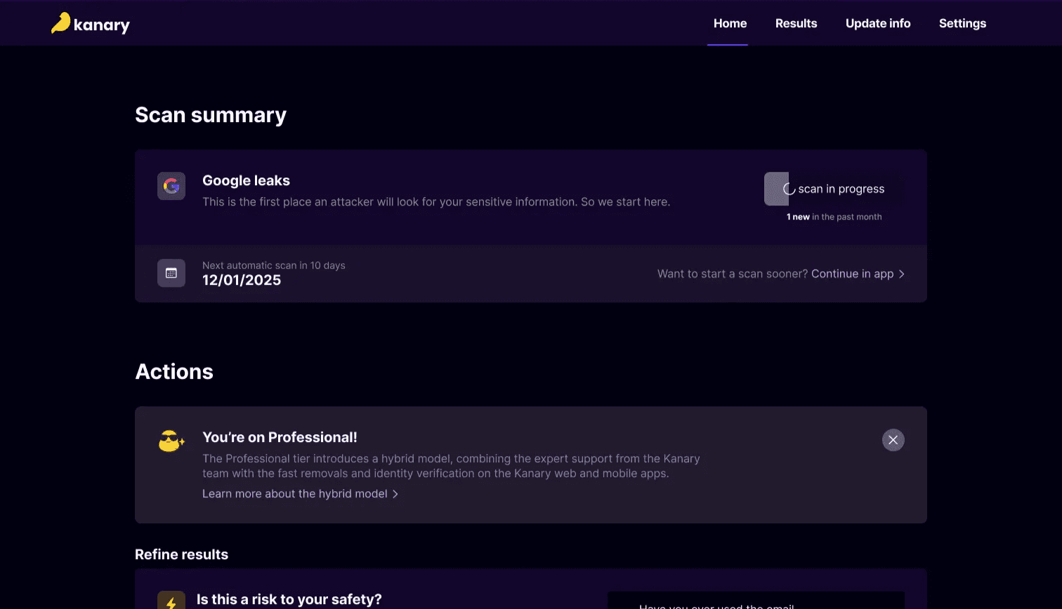 After the scan completes, Kanary determines which results are risky and which results are actually about you. Most of the time, it gets it right and you can start removals right away. When the system isn’t sure, it will ask for your input on results before it starts removing them. We don’t want to remove something good about you online, like media coverage or a professional profile. But in cases where someone might be impersonating you on a legitimate platform, we can catch it. You’ll be able to quickly tap ‘yes’ or ‘no’ about results if they are about you. Then do the same if they are a risk to your safety and you want them removed. After you share this feedback once, the system will do a better job recognizing results about you next time. If you notice Kanary missed an important exposure, you can add results and our team will review and make sure the best next steps are available on the platform.