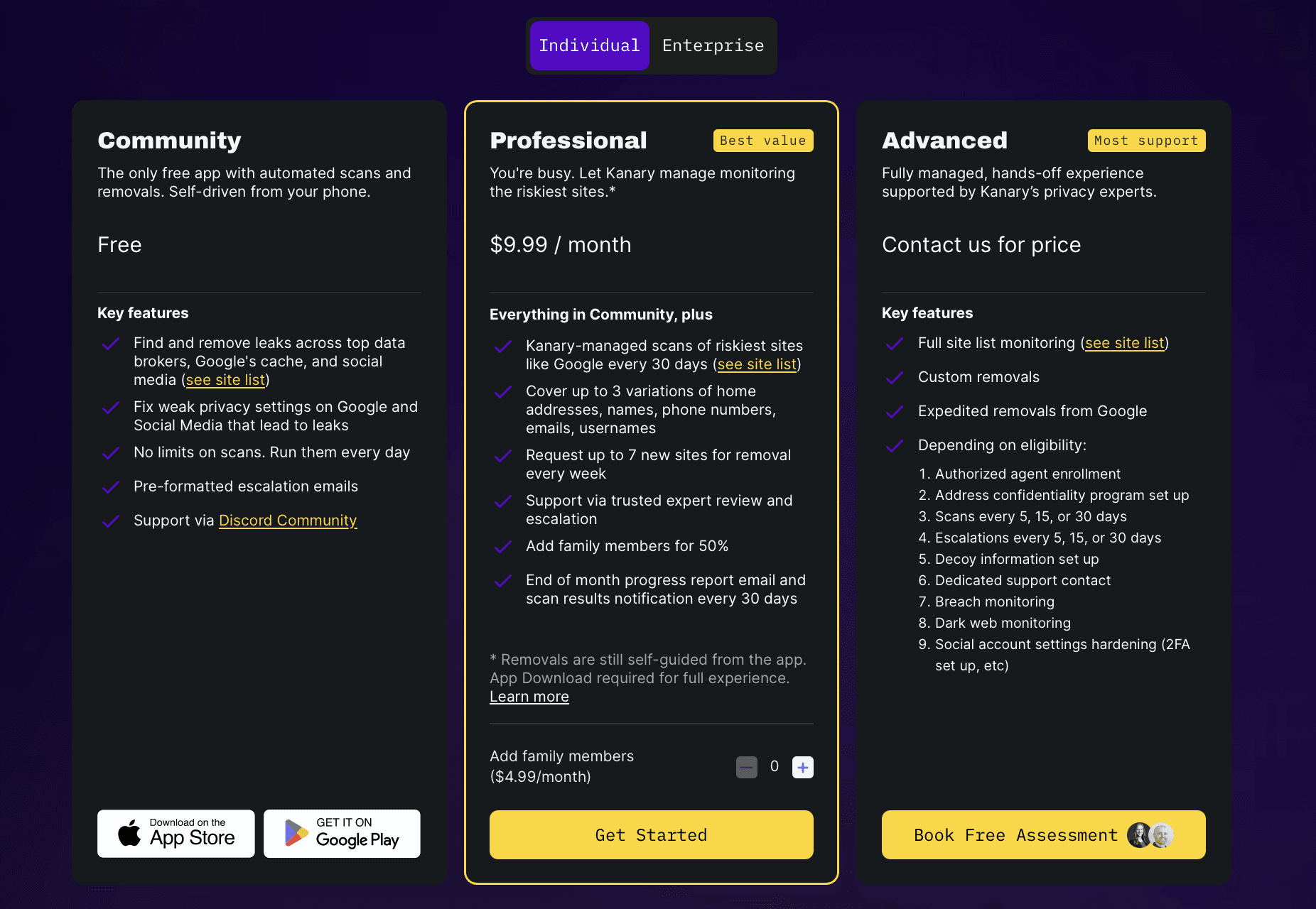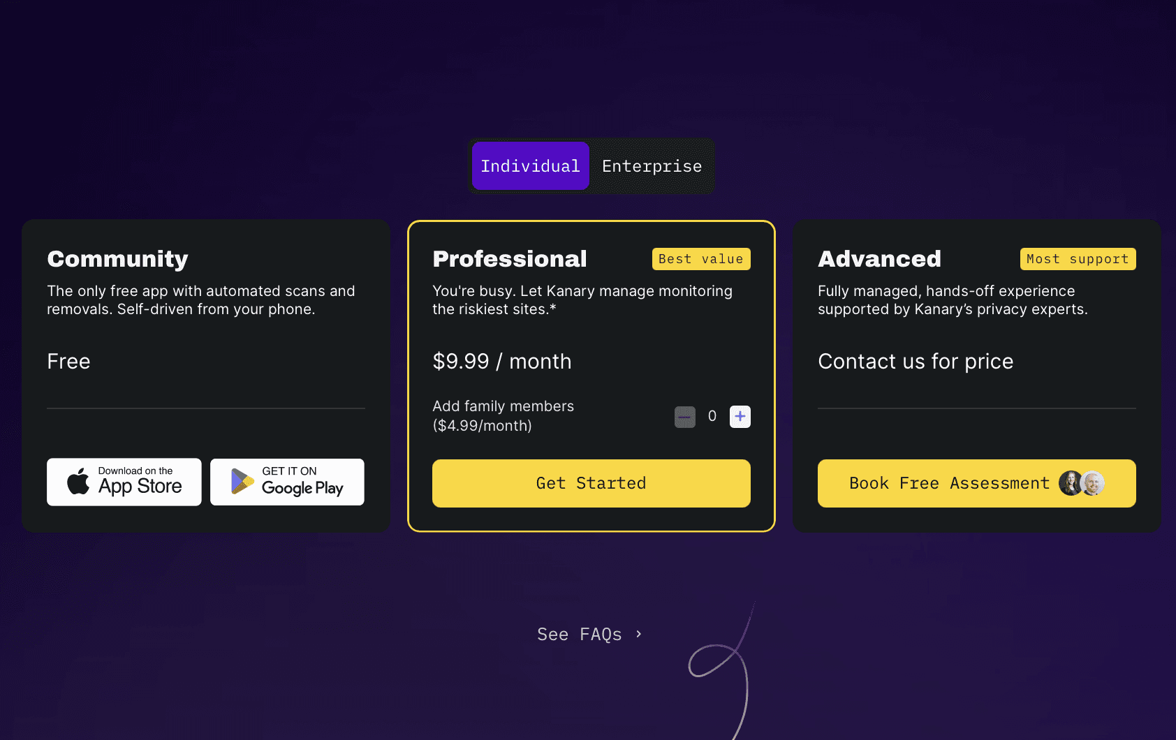 For more details on Kanary’s Community, Professional and Advanced tiers, please checkout our website and continue to the deep dives below. The Professional tier takes less than 5 minutes to join, and scans start immediately. The Advanced tier includes a complimentary 20 minute assessment before getting started. We’ve onboarded hundreds of executives through our Enterprise tier over the last 6 years and are excited to offer this Advanced service to individuals who need a higher level of support from our team.