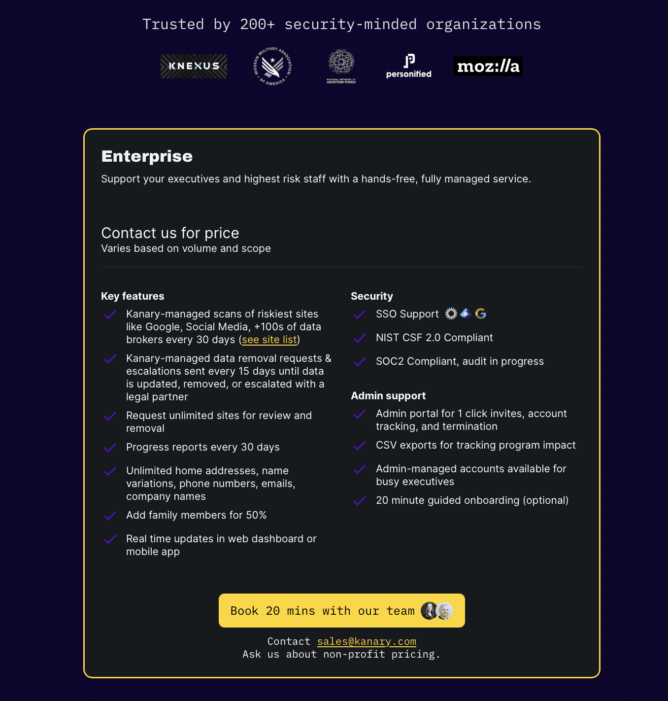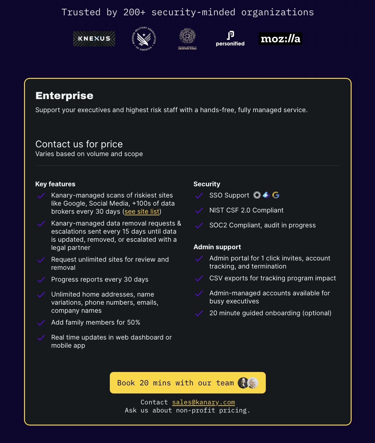 200+ organizations and enterprises work with Kanary as a part of their executive protection program or as an employee benefit. As companies ask their employees to represent them at events or on social media, they open them up to targeting, scams, and spam. Partnering with Kanary is the best way to support your employees' personal safety and security without adding more the plate of your security team.