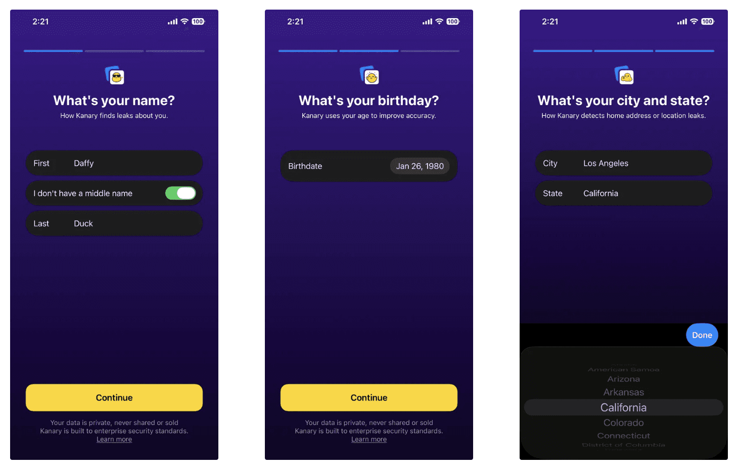 Set up your account by adding a name, city/state, and birth year. Kanary can identify hundreds of matches with just that information. Many attackers start with this basic information so it’s important to start there then go deeper. You’ll be able to add information and refine results after your first scan.