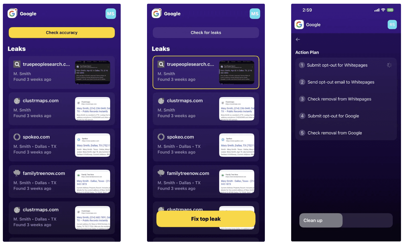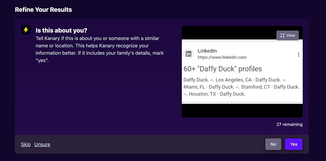 After the scan completes, Kanary determines which results are risky and which results are about you. Most of the time, it gets it right and you can start removals right away. But in certain cases, when the system isn’t sure, it will ask for your input on a subset of results. We avoid accidentally removing something good about you online, like media coverage or a professional profile. But in cases where someone might be impersonating you on a legitimate platform, we can catch it. You’ll be able to quickly tap ‘yes’ or ‘no’ about results if they are about you. Then do the same with a subset of results if they are a risk to your safety and you want them removed. After you share this feedback once, the system will do a better job recognizing results about you next time.