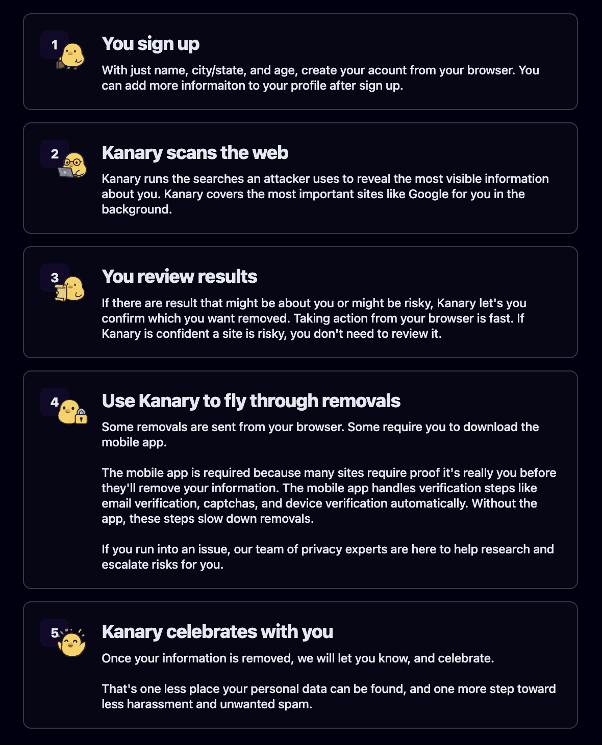 Kanary is a first-of-its-kind data removal service. We combine proprietary technology with a team of analysts to continuously identify where personal information is exposed online, remove it, and prevent future leaks. Kanary helps you prevent and respond to stalking, harassment, doxxing, and deepfakes.