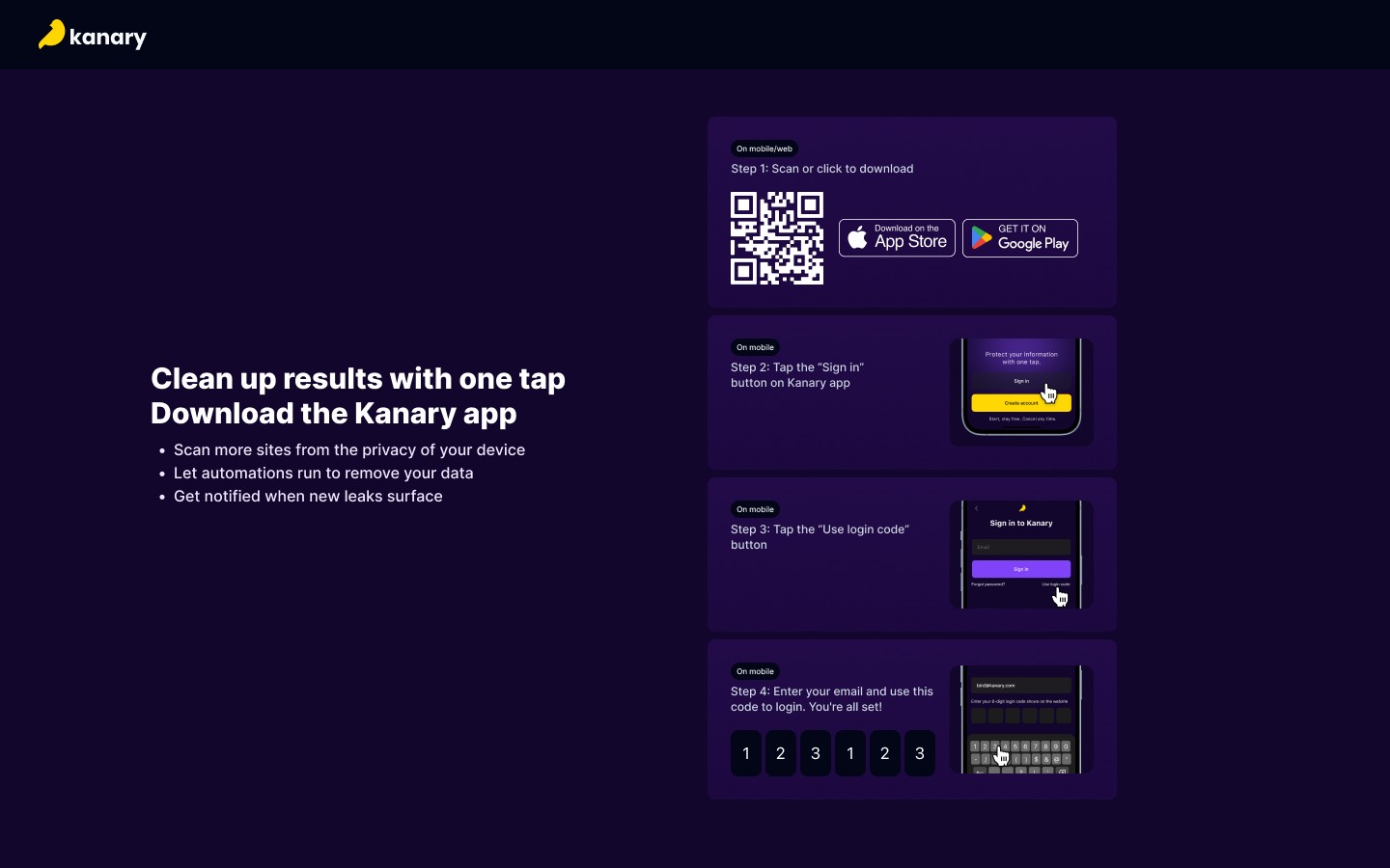 After the scan completes and you’ve reviewed results, you’ll be ready to take action. Depending on the risks Kanary finds, you may see options to suppress results on web, send emails, or download the app to run more automations. You’ll see step by step instructions for downloading the app. It should take you less than a few minutes and make scanning and removing data faster.