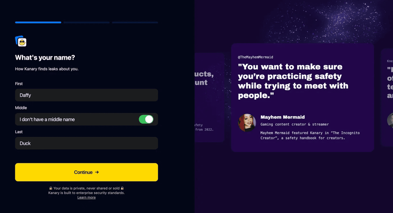 On the dashboard you’ll be asked to complete your profile. You can add up to three variations of your name, places you’ve lived, phone numbers, email addresses, and social media handles. While Kanary is good at finding your exposures with an initial set of data, filling out this extra info will allow Kanary to check more sites and match your information with more accuracy.