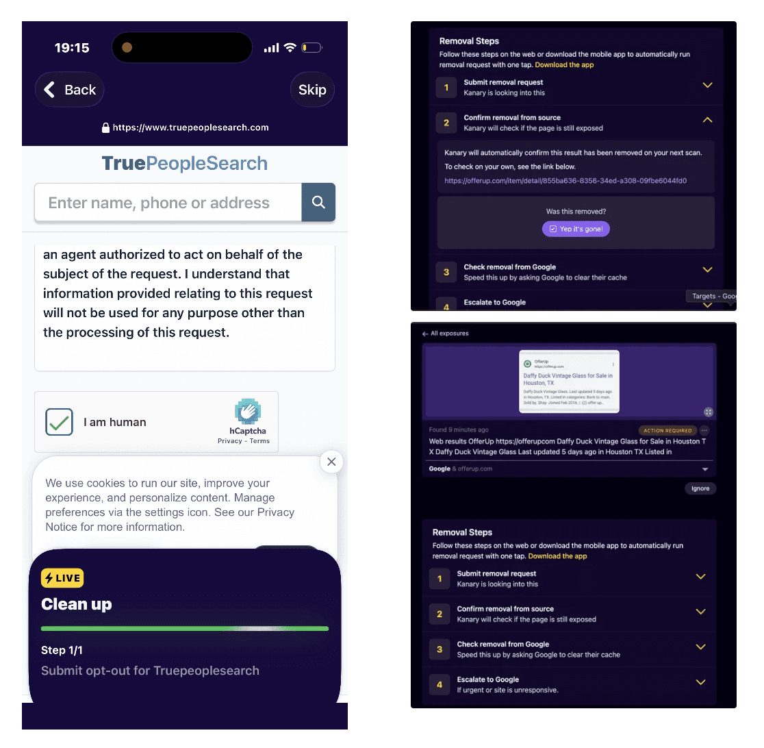 Kanary runs automated scans, removal requests, escalation emails, regulator complaints, and account security settings audits and fixes